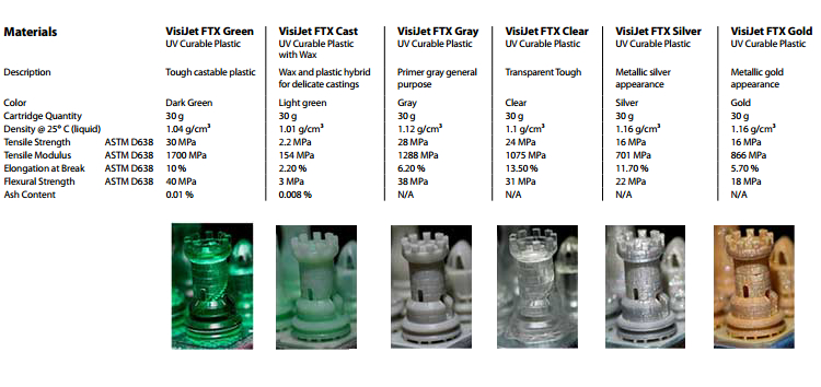 The VisiJet® FTX Gold material was created especially for the ProJet® 1200. This is a UV-curable plastic with a metallic, gold appearance.
